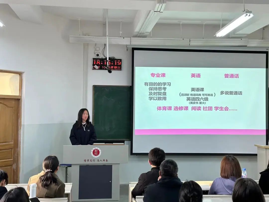 随后,高年级优秀学生代表李佳奇、楼康炜、单奎、佘青青和赵艳等同学分享了自己的学习经验和收获,强调了掌握学习方法和技巧、制定学习计划和目标的重要性,并围绕如何利用网络资源、参加课外活动、做好笔记和复习等方面进行了交流。在互动环节,师生就课程设置、实习实践、考研就业等问题进行了深入探讨与交流。学生们积极发言,踊跃提问,老师们耐心解答,气氛十分热烈。学长学姐们还分享了各自的学习计划和目标制定方法,鼓励他们要勇于尝试和探索,不断拓展专业学习领域。