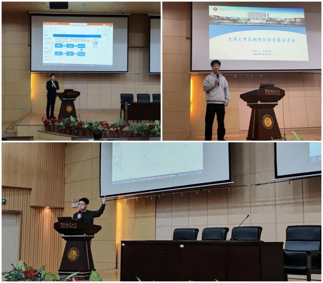 赵方主持会议并解读文件之后,优秀学生代表进行了分享。物理学2022-2班赵家辉结合自己在物理实验竞赛中的经验,深入阐述了科学实验设计的重要性。物理学2022-4班许跃彬分享了他在物理实验竞赛中的心得,鼓励同学们发挥创新思维,注重探索性创新,并强调了团队沟通在竞赛中的关键作用。2024级研究生何国铭同学则讲述了自己在师范生教学技能竞赛中的体会,他提到,尽管备赛过程充满挑战,但也是难得的自我提升和专业能力提升的机会。