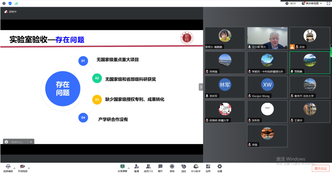 首先,实验室主任艾尔肯·斯地克教授就实验室自成立以来在科学研究、人才培养、平台建设、合作交流等方面取得的进展,重点实验室验收存在的问题,解决问题的思路进行了全面而详细的汇报。在重点讨论环节,新疆大学贾殿赠教授、美国南佐治亚大学王笑军教授、东北师范大学张昕彤教授等专家围绕实验室的验收准备工作及未来发展规划进行了深入交流。与会专家对实验室取得的成绩给予高度评价,并就如何进一步提升科研创新能力、加强国内外合作、拓宽研究方向、培养高层次人才等方面提出了宝贵意见和建议。针对验收的准备工作,专家们对材料准备、成果展示、答辩策略等方面进行了具体指导。