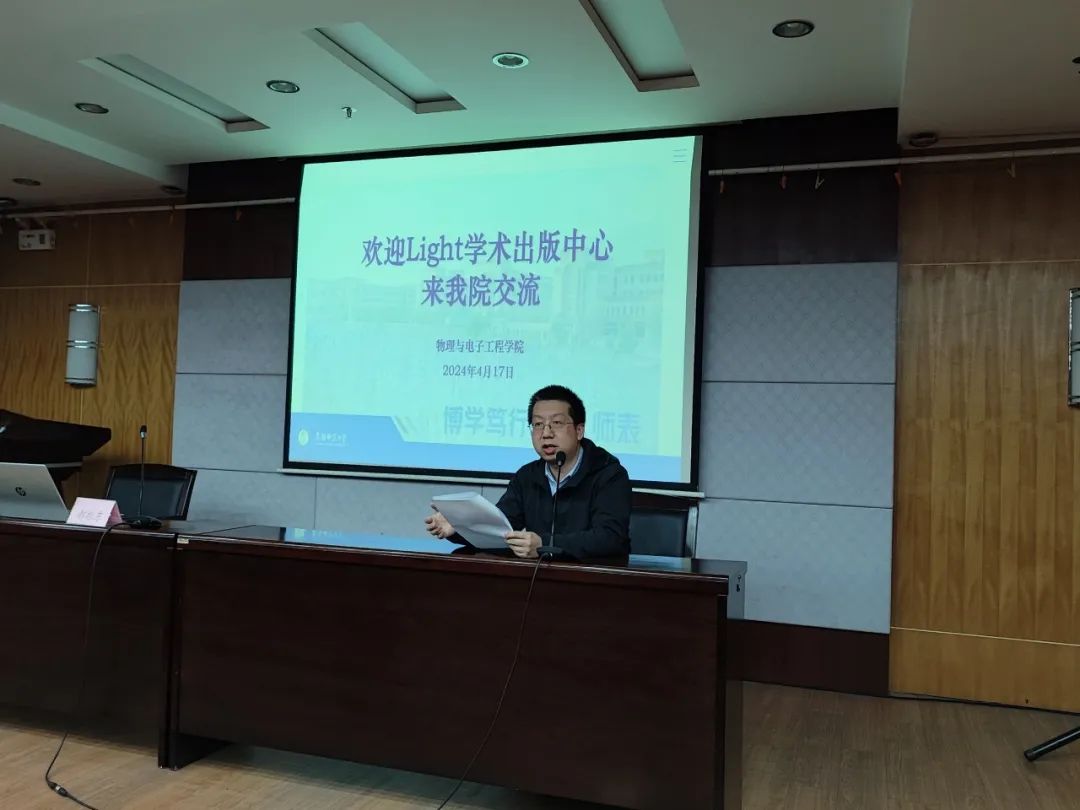 为进一步提升师生科研能力和学术写作水平,为师生提供优质科研成果展示平台,4月17日,beat365平台官方网站特邀Light学术出版中心总编、《Light: Science & Applications》(影响因子19.4)学术编辑李耀彪研究员和Light学术出版中心副总编、《Light:Science & Applications》学术编辑郝振东到学院进行学术讲座。讲座由副院长戴鹏鹏主持,全体研究生和培优班学生共100余人聆听讲座。