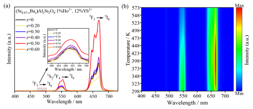 a.Sr0.87-xBaxAl2Si2O8:1%Ho3+,12%Yb3+荧光粉的上转换发射光b.Sr0.37Ba0.5Al2Si2O8:1%Ho3+,12%Yb3+热演化UCL光谱等高线图