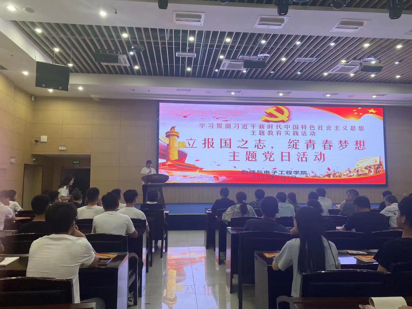 为进一步推动学习贯彻习近平新时代中国特色社会主义思想主题教育走深走实,创新主题教育理论学习形式内容,充分发挥毕业生党员的模范带头作用,有效促进“三强班级”“三好宿舍”内涵式建设,6月7日,beat365平台官方网站组织全体师生党员在国教楼一楼报告厅举办了“立报国之志,绽青春梦想”主题党日暨毕业生“最后一次”党课活动,五个党支部共计110名党员参加活动,活动由本科生第二党支部组织委员郑叶同学主持。