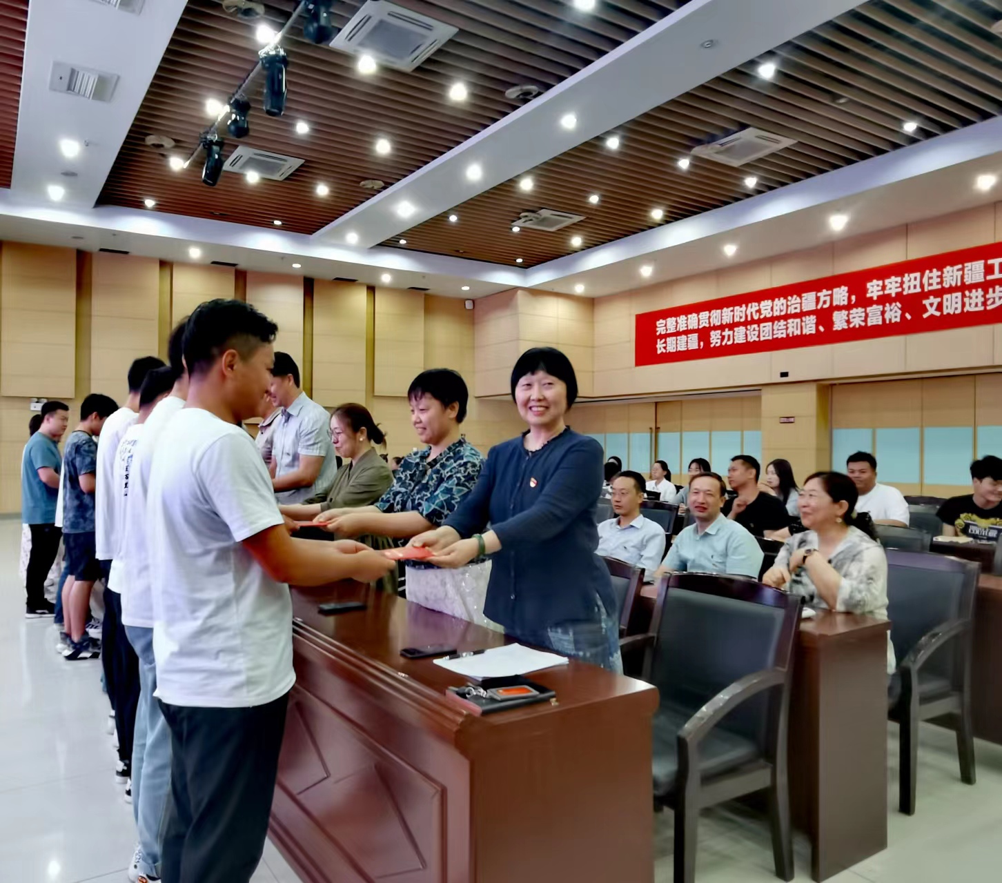 学院党委还在活动现场为全体毕业生党员赠送了新修订的《中国共产党章程》,党员教师代表、教师第二党支部书记王静对全体毕业生党员寄语,她希望大家能将个人理想融入时代的洪流,与祖国发展同频共振,在各自的岗位上继续为祖国贡献青春力量,在她的提议下,全体党员同志共唱《我和我的祖国》,将活动推向了高潮。