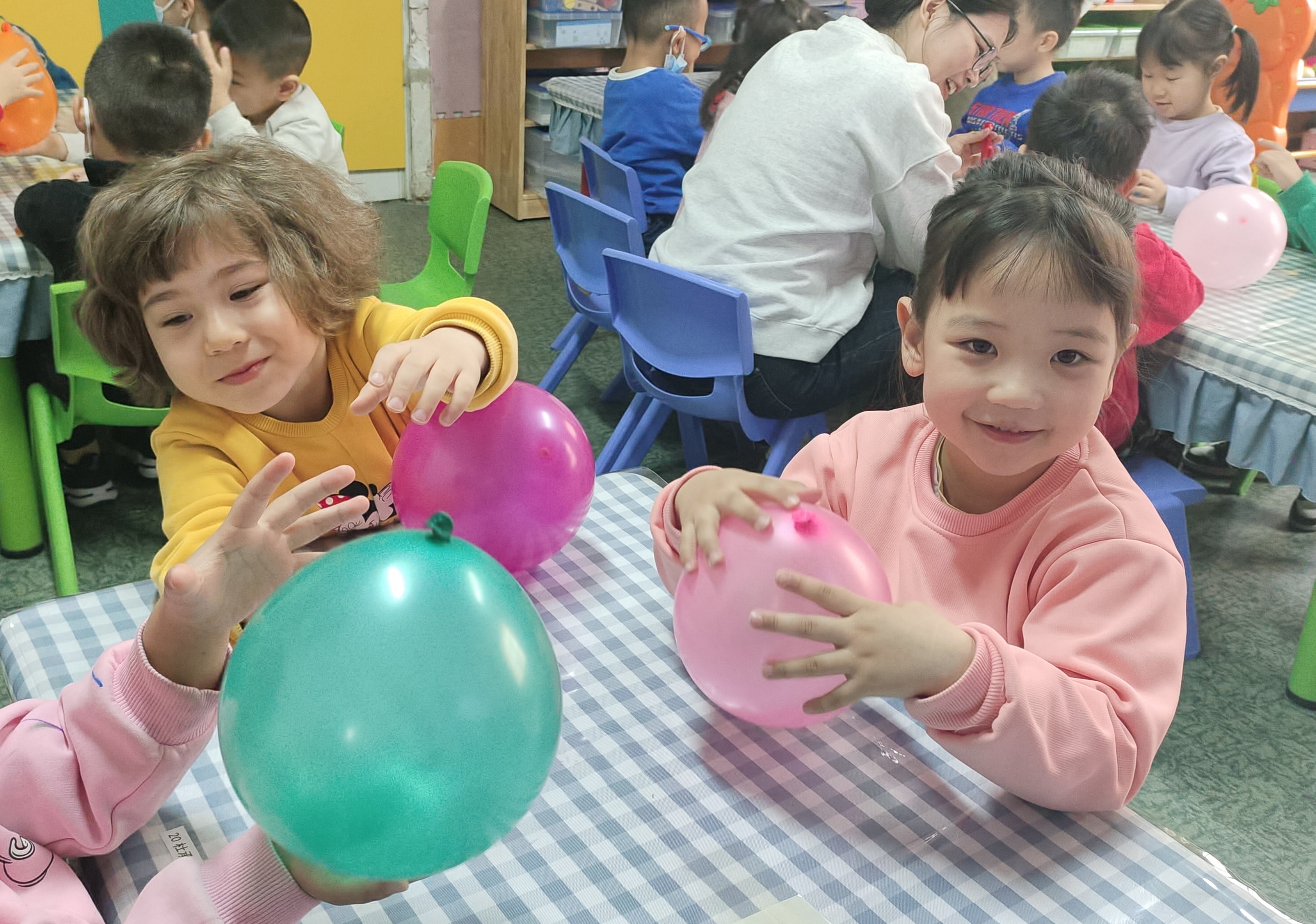 孩子们在展示自己制作的不倒翁