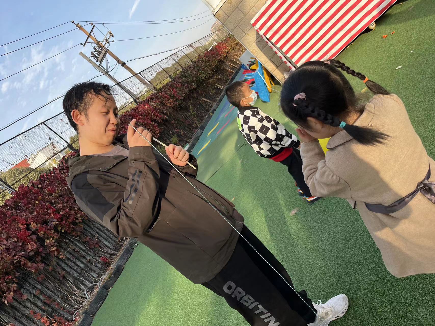 儿童是天生的科学家,他们有着无穷无尽的好奇。在“旋转喷泉”的环节中,寻找一个废弃的塑料瓶,清洗干净,并用大头针扎洞,然后在瓶子中倒入水,并迅速拧上瓶盖,通过开关瓶盖控制喷泉。装满水并拧紧瓶盖,由于瓶子内部与外面空气隔绝,所以在外界大气压作用下,几个洞并不会向外喷水。松开瓶盖后,外部气体进入瓶子中,使瓶子内外大气压相同,由于液体受到重力作用,另外液体压强随深度增加而增加,所以水就会从洞中喷出了。虽然物理原理艰涩难懂,但我们使用浅显易懂的言语让孩子们在活动中感受大气压强,理解大气压强。