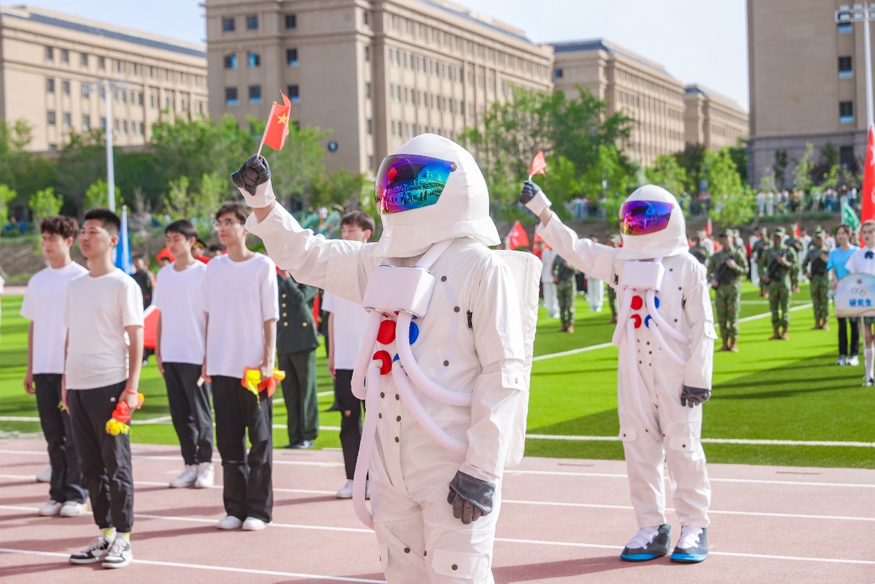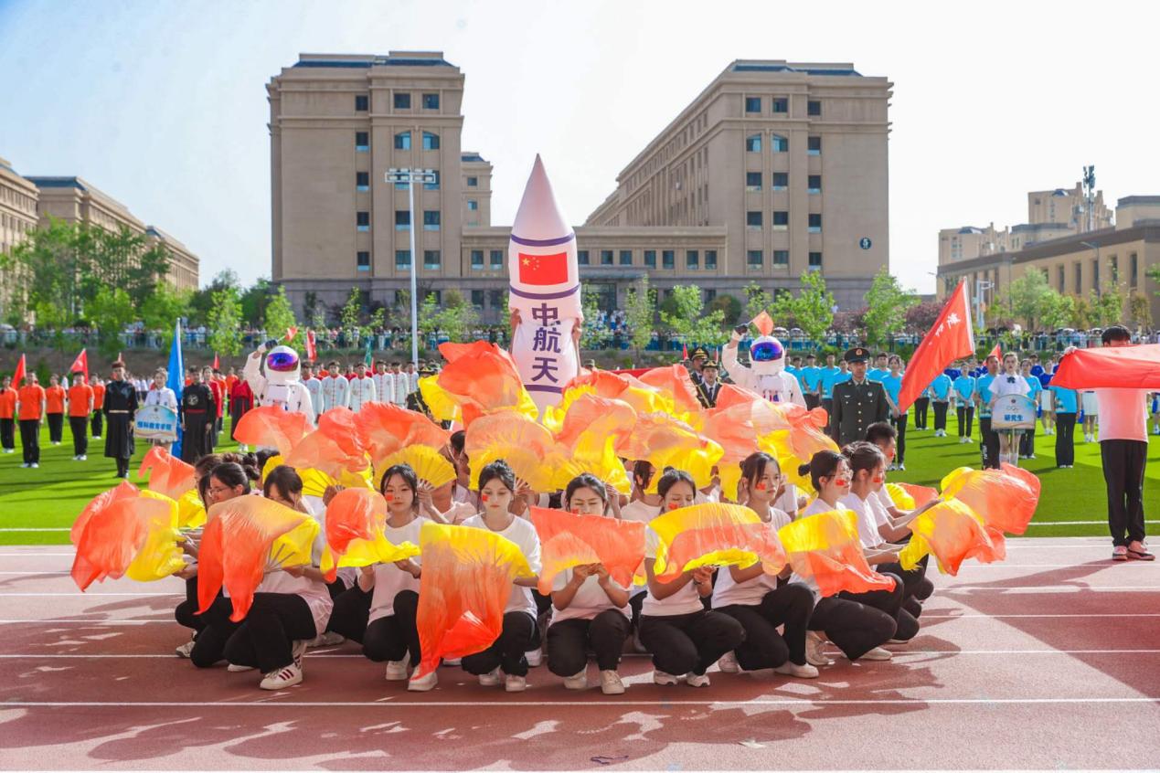 物电学子自信满满,热情高涨,步伐整齐,精神饱满。在中国航天火箭模型的映衬下,学生们纷纷挥舞着手中的扇子,仿佛是在演绎着熊熊燃烧的火焰。这一幕象征着他们如同火箭一般,勇往直前,充满了青春的活力与激情。