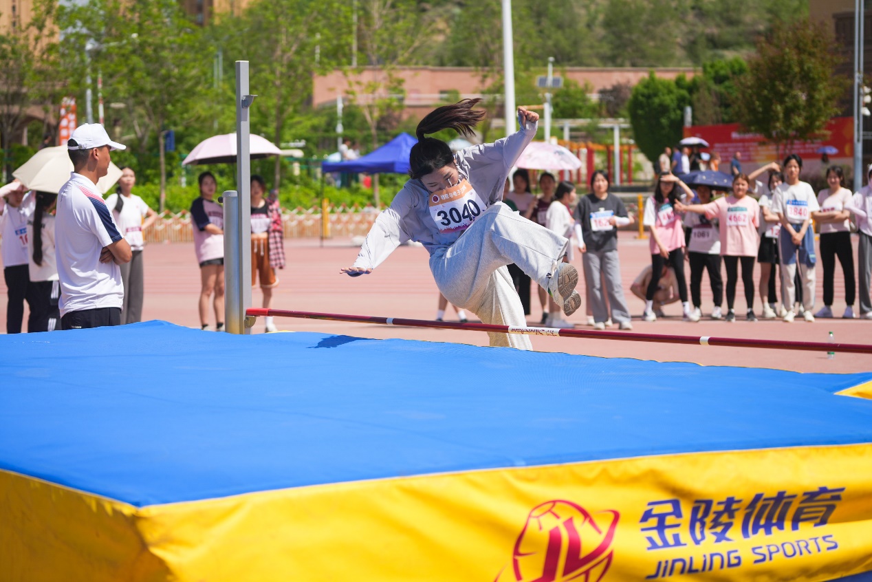 腾空一跃展英姿,跨越横杆显勇志。