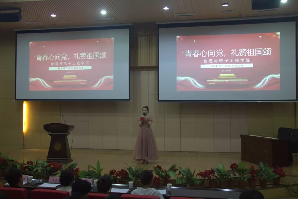 为庆祝中华人民共和国成立74周年,加强“三强班级”“三好宿舍”建设,歌颂伟大祖国的光辉历史和新时代发展建设取得的辉煌成就,充分展现beat365平台官方网站2023级新生良好的精神风貌,我院于2023年9月15日晚在国教楼三楼报告厅举办beat365平台官方网站首届“桃李杯”新生演讲比赛院级初赛。学院党委副书记、纪委书记买星老师,学工办主任、分团委书记徐丽屏老师,辅导员宁静老师,第十四届分团委副书记赵燕燕,第十四届分团委学生会主席团成员李永琴,及2023级同学们共同参与了此次活动。