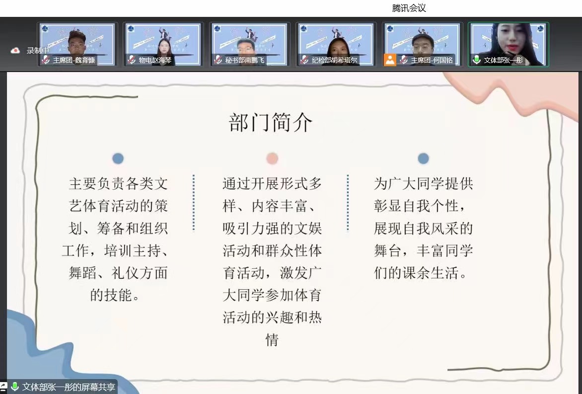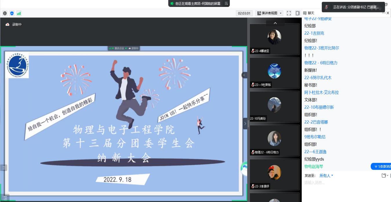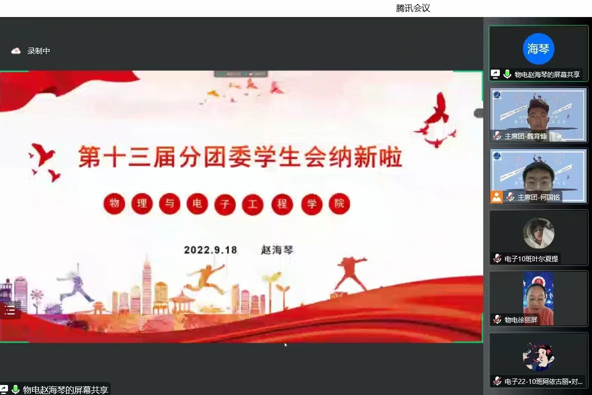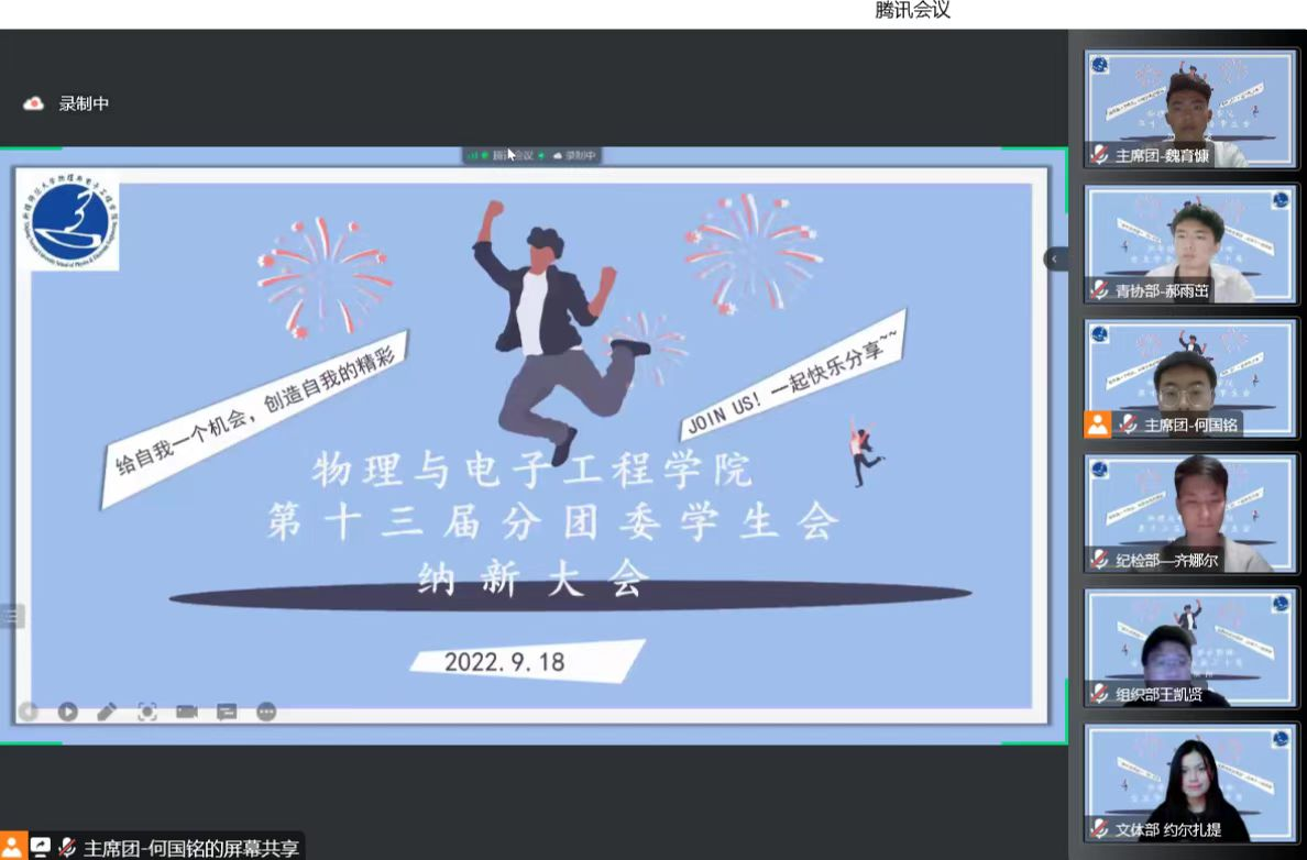 为向2022级新生提供锻炼综合能力的平台,帮助新生做好大学生活规划,9月18日,beat365平台官方网站分团委学生会组织召开了学生会预备成员纳新答疑会,会议以腾讯会议的形式召开。学院学工办全体老师、第十三届分团委学生会全体成员及2022级部分新生共计200余人参会。会议由学生会主席团成员何国铭同学主持。