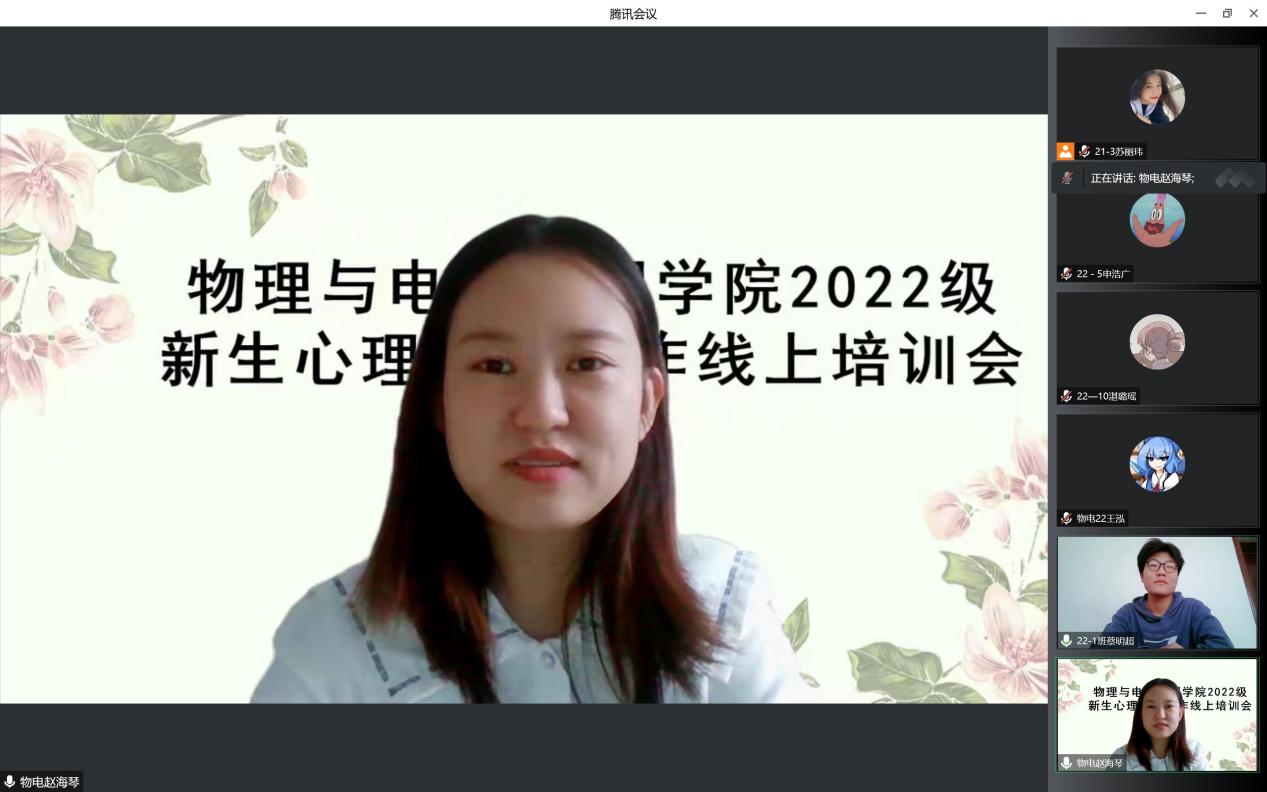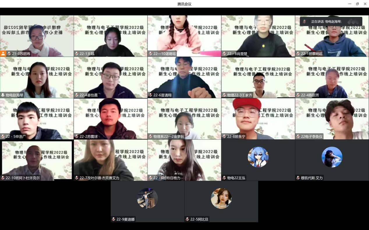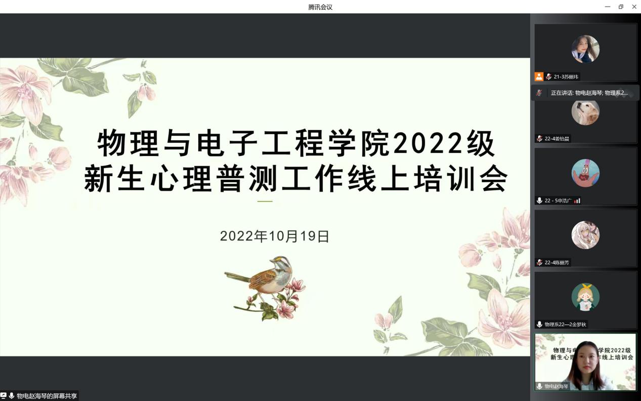 全面了解和把握我2022级新生整体的心理健康状况,全面推动新学期我院心理健康教育工作的发展,进一步提升我院大一年级心理委员在心理健康教育工作中的积极影响,我院于1019日下午1600在腾讯会议线上开展了2022级新生心理健康普查培训暨2022秋季院级心理委员培训会