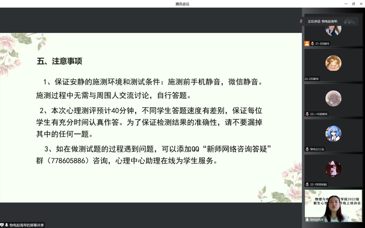 首先,赵海琴老师为大家详细讲解了心理普查的重要性、普查流程、以及心理普查“十问十答”和注意事项。接着赵老师组织全体2022级心理委员进行了线上见面,在个人介绍和交流研讨中,师生积极互动、交流、沟通,很快就让心理委员们熟悉了起来,拉进了彼此之间的距离。最后,赵老师为大家做了心理委员培训,讲述了心理委员的重要性、工作职责、工作要求和考核方式。她强调心理委员是班级心理知识的传播者、心理健康的守护者,她希望心理委员能够充分探索自身发展,更好地发挥学生之间互帮互助的工作优势。