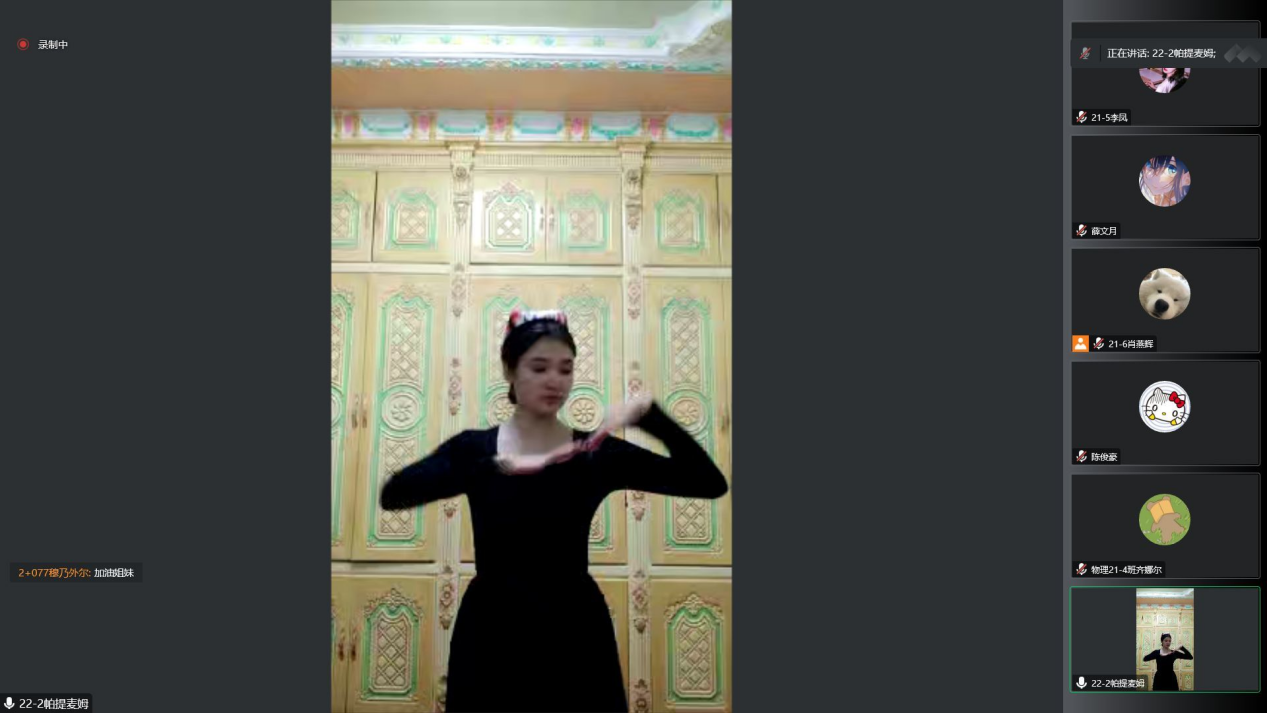 正演开始前,主持人播放了由学生会文体部成员录制的《如愿》,表达了希望疫情早日结束、所愿皆成真的美好愿望。伴随着主持人精彩的开场,16名表演人员依次进行了才艺展示。首个出场的是物理22-6班闫富强同学,一首《晴天》带给大家了美好的回忆、美好的感动、美好的故事;接下来是物理22-6班郭可盈钢琴演奏《童年的回忆》,瞬间激起了同学们对童年的美好回忆、对生活的热爱;少数民族独有特色的乐器冬不拉在电子22-8班叶尔哈提同学的手上弹出了另一番风味;电子22-7班陈杨杨带来的爵士舞蹈《what are you waiting for》更是燃爆了全场!