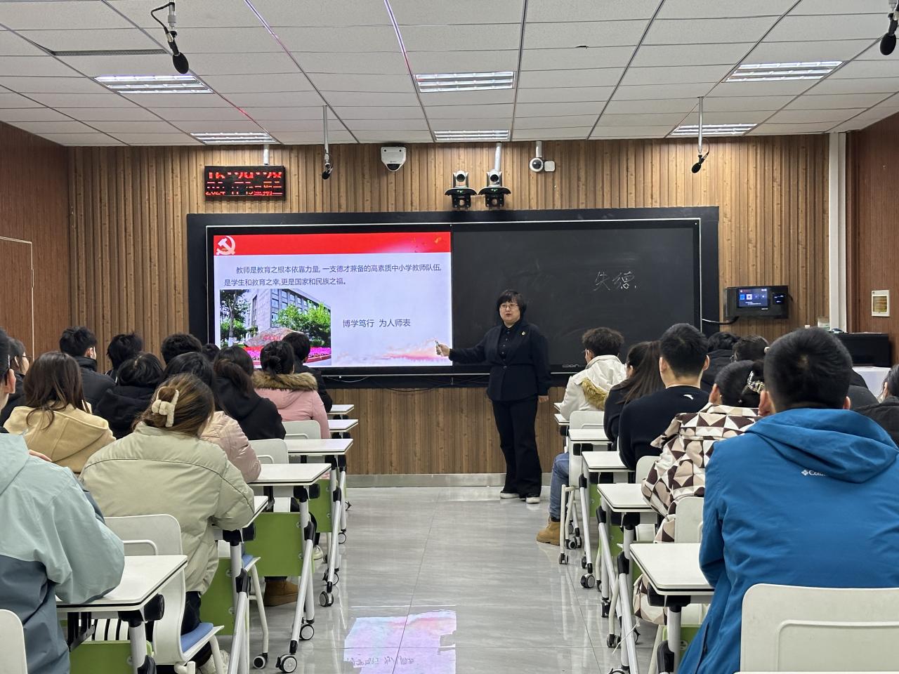 本次微班会由全国优秀教师、课程与教学论(物理)学术带头人张冬波老师主讲。她围绕师德师风教育,通过讲述陶行知“四颗糖”故事和张桂梅老师的感人事迹,向大家传递了教育的真谛:关爱和尊重学生。陶行知先生、张桂梅老师无私奉献、关爱学生的精神,对在场同学产生了深刻的影响。