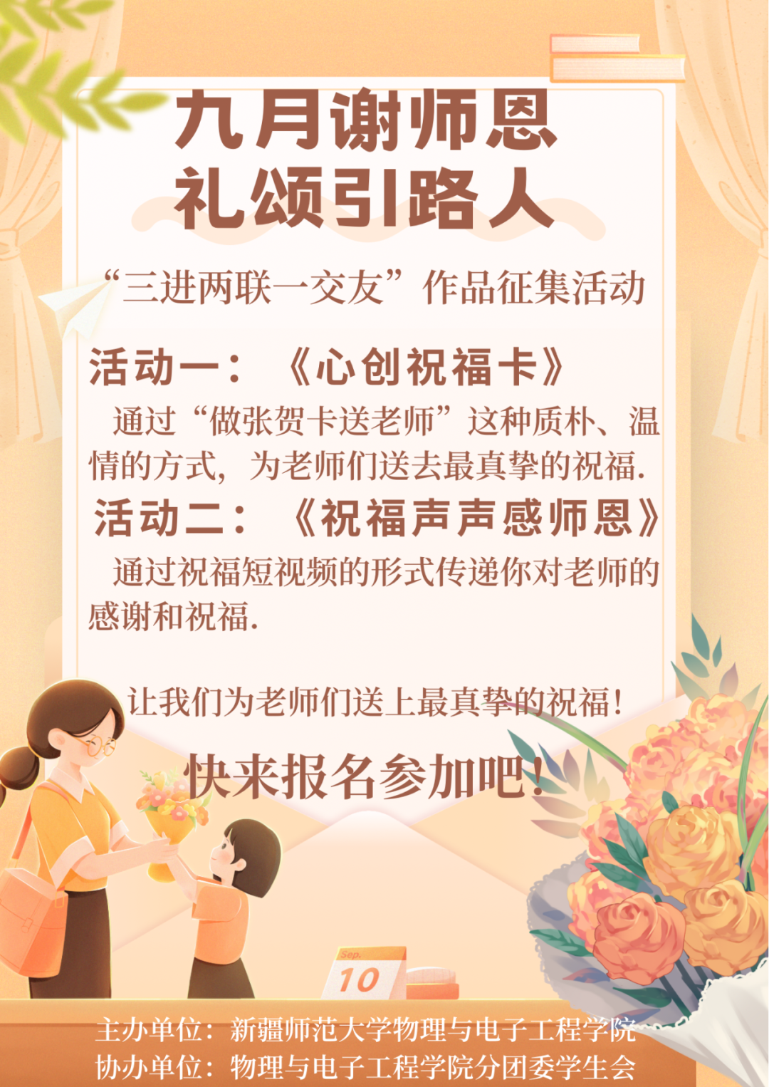 厚谊常存魂梦里,深恩永志我心中,人生的旅途中,我们会遇到对我们产生深远影响的老师。教师,是一个神圣的职业,那三尺讲台上,绽放的是一个老师对学生殷切的期望和无私的奉献,“春蚕到死丝方尽,蜡炬成灰泪始干”您燃烧着自己,却照亮了我们,多少年过去,流逝的是时光,难忘的却是老师,是那些曾经刻在心上的谆谆教诲和切切关怀。在第40个教师节来临之际,beat365平台官方网站开展“九月谢师恩,礼颂引路人”主题作品征集活动,欢迎同学们为我们和蔼可亲的老师们送上最真挚的祝福!