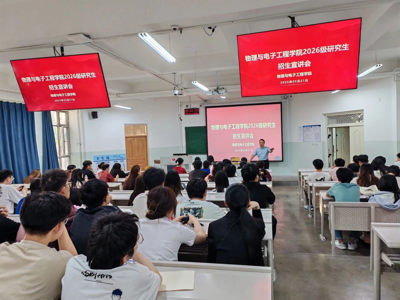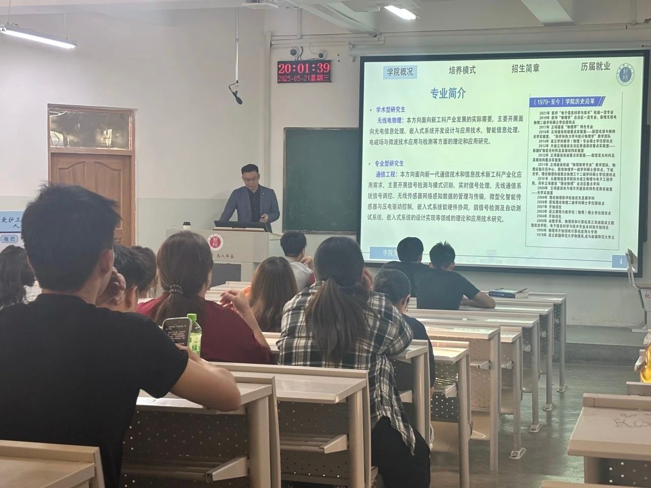 为落实学校本科生考研工作部署,进一步提升学院研究生生源质量,助力学生科学规划升学路径,5月21日,beat365平台官方网站在合堂楼101和301教室分别举行2026年物理学专业与电子信息专业考研宣讲会。物理学专业宣讲会由分管研究生教育工作的副院长戴鹏鹏老师主持,电子信息专业宣讲会由电子教研室主任李亮老师主持,2022级150余名学生参加。