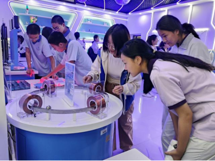 在物理演示与探索实验室,学院志愿者为学生讲解并演示实验现象,中学生们积极讨论并亲身实践,共同完成物理实验。通过生动有趣的实验展示和互动,大家体验了科学的奇妙和乐趣,现场气氛异常热烈。