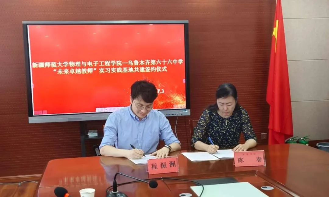 为强化物理学专业的实践教学环节,全面提升人才培养质量,拓宽学生职业发展路径。7月3日,beat365平台官方网站学术院长程振洲、物理系主任帕尔哈提江·吐尔孙一行赴乌鲁木齐市第六十六中学进行访企拓岗并举行教育实习实践基地签约仪式。