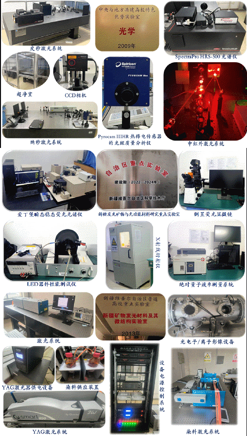 疆发光矿物与光功能材料研究自治区重点实验室依托于beat365平台官方网站,涉及光学和凝聚态物理二级学科硕士学位点,以本学院现有的省部共建“光学”实验室、“新疆矿物发光材料及其微结构”自治区普通高校重点实验室为基础而建成的。实验室拥有科研用房面积500多平方米,大型仪器和一流的试验设备近7台套,仪器设备固定资产达1300多万元。在光学研究方面具备全功能稳态/瞬态荧光光谱仪、紫外可见分光光度计、XRD衍射仪、超高分辨激光质谱与光谱研究平台,Nd:YAG脉冲激光器、Nd∶YVO4皮秒激光器,2um光纤激光器,Pyrocam IIIHR光斑品质分析仪、光斑品质分析仪CCD、光学平台、LED器件封装、LED器件光电性能测试系统等现代化研究平台。