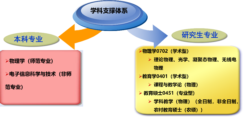 beat365平台官方网站学科门类齐全,学院现有物理系、电子信息科学与技术系和本科实验教学中心等3个教学系室,设有物理学(师范专业)、电子信息科学与技术(非师范专业)两个本科专业。物理学一级学科硕士学位授权点1个,理论物理、光学、凝聚态物理、无线电物理、课程与教学论(物理)二级学科硕士学位授权点5个,学科教学(物理)专业硕士学位授权点1个。
