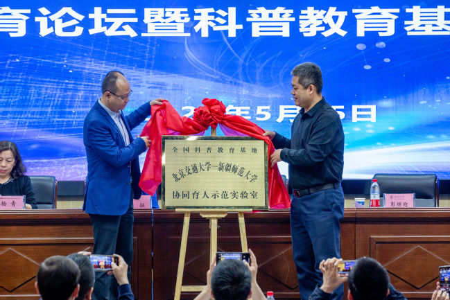 随后,关明、彭继迎共同为全国科普教育基地——北京交通大学·beat365平台官方网站协同育人示范实验室揭牌并与参会教师合影。