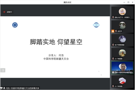 活动中,闫浩博士首先分享了自己在新疆天文台多年学习和工作的经历、经验和收获,向大家介绍了新疆天文台的观测设备,对各类天文仪器的科学理论进行了详细而又全面的讲解,将冰冷的机器赋予了生命的温度,使之活灵活现的展示在我们眼前。闫浩博士对射电望远镜的详细讲解,帮助同学们对射电望远镜的组成结构、科学原理、不同类型射电望远镜的作用原理区别以及我国射电望远镜发展现状等有了进一步的了解,开拓了视野,也激发了同学们对天文学的向往与热爱。